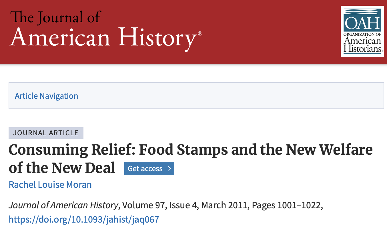 ![]() “Consuming Relief: Food Stamps and the New Welfare of the New Deal,” Journal of American History (March 2011) |